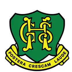 The school was opened in 1933 as "Griffith Intermediate High School" at the cost of 15,000, with the foundation of the main building laid by the Minister for Education, David Drummond, on 8 March 1933.[1][2] The school was upgraded to a fully comprehensive high school in July 1939.[3] The school's badge consists of a green shield with the school's abbreviation "GHS" inside in gold, set above a gold scroll containing the motto. The motto, Postera crescam laude ("Later I shall grow by praise" or, more freely, "We shall grow in the esteem of future generations") is from a line in Horace's Odes: "ego postera crescam laude recens". It is also the motto of the University of Melbourne.