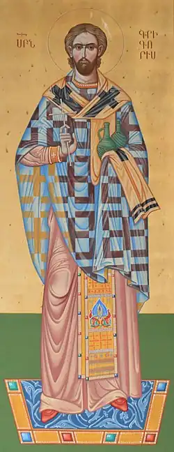 By 325, Christianity in Armenia had gained strength and Armenian religious leaders went on to proselytise the neighbouring states. According to the tenth-century author Movses Kaghankatvatsi, Gregory the Illuminator left Armenia to spread Christianity in Caucasian Albania, where on his orders there was built a church later to become the Amaras Monastery. He then ordained his grandson Grigoris, at the time only 15 years old, to become the patriarch of the Church of Caucasian Albania.[3] However, there is another tradition attaining the ordination to his uncle St. Aristakes.[4] He is considered a successor to Thomas of Satala, apparently first catholicos of Albania serving during the time of King Urnayr of Albania.[5][1] Traditionally he is also considered to bring relics of Zechariah and Saint Pantaleon to church built in the town of Tsri.[4]