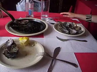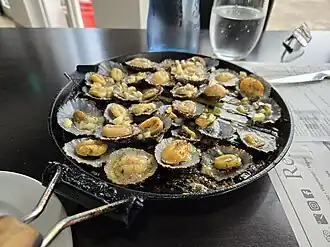 Grilled limpets (Portuguese: Lapas grelhadas) are a typical delicacy in the cuisine of the archipelagos of the Azores and Madeira, consisting of seasoned and grilled lapas (limpets) in their own shells usually consumed as an appetizer. The species Patella aspera and Patella candei are the species most commonly used.[1]