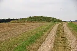 The hamlet is 650 yards (600 m) south of a deserted medieval village (DMV), not mentioned in the Domesday Book.[5] Grim's Mound, 650 yards west from the DMV, is a Bronze Age bowl barrow, 62 feet (19 m) in diameter and 9 feet (2.7 m) high. It contains archaeological items, including human remains, and is an ancient scheduled monument.[6]