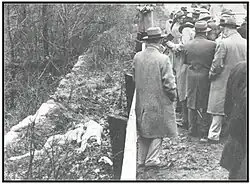 The girls' bodies lay upon a flat, horizontal section of snow-covered ground directly behind the guard rail, which extended for just 10 feet (3.0 m) before the incline of the embankment of Devil's Creek.[33] Barbara lay on her left side, with her legs drawn slightly up toward her torso. Patricia lay on her back, with her body covering her sister's head, and her own head turned sharply to the right.[5] It is believed the sisters had most likely been driven to this location in a car, with their bodies then being dragged or lifted out of the vehicle, then placed or thrown behind the guard rail.[16] Three wounds resembling those typically inflicted by ice picks were discovered upon Barbara's chest and injuries resembling blunt force trauma were visible upon her face and head,[34] while numerous injuries resembling bruises were discovered upon Patricia's face and body.[35] The girls' father, Joseph Grimes, was driven to the crime scene to formally identify both bodies.[17][n 8]