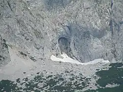 Southwest of the main summit is the Grimmingtor (Grimming Gate), a roughly 50-metre-high and 15-metre-wide recess in the rock face, capped by a 10-metre-thick rock overhang. To the east it is bounded by a large rib of rock, which is why, in certain light conditions, it has the appearance of a gate. According to legend, rich treasures have been hidden behind this "gate".