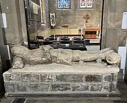 The recumbent effigy is that of Sir Thomas Haslerton. A 14th-century knight from a family owning land on the north bank of the Humber, Sir Thomas also held land at Aylseby. Sir Thomas was celebrated locally for his generous patronage, rebuilding St Leonard's Nunnery which had been destroyed by fire. The nunnery was located at the junction of Bargate and Weelsby Road which is today still known as Nun's Corner.[3]
