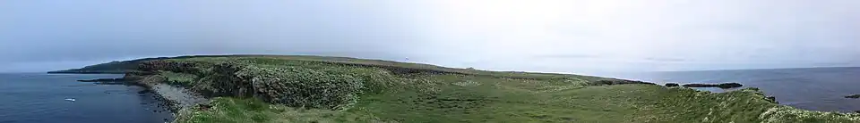Though treeless, the island's vegetation cover is rich, consisting of marshland, grass, and moss, and the island is home to many birds, especially auks.[12][13] Gulls and arctic terns also inhabit the island.[14] The island has been designated an Important Bird Area (IBA) by BirdLife International because it supports large seabird breeding colonies of black-legged kittiwakes, Atlantic puffins, razorbills and common murres.[15]