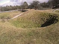 Grin Low was the main location for the early Buxton lime industry. It was an extensive area of limestone quarrying and was licensed for lime burning from 1662 by the 1st Duke Of Devonshire. Demand for lime grew dramatically during the Industrial Revolution. There are widespread remains of over 100 large 'pudding' lime kilns, built of earth and rock, which date from the 17th–19th centuries. The land is also covered in spoil heaps of waste material. Coal came from local collieries at Axe Edge and Goyts Moss. In 1820 the 6th Duke of Devonshire commissioned the 'Grin Plantation' (now the wooded Buxton Country Park) to shield the scarred lime-burning landscape from visitors to the spa town of Buxton. The Cromford and High Peak Railway opened in 1831 and passed by Grin Low. The railway allowed the lime to be transported to canals and generated expansion of quarrying in Buxton. In the 1850s lime production at Grin Low moved to a new large quarry on the south side of the hill (which was operated until its closure in 1952). In 1890 Grin Low produced 90,000 tonnes of lime.[2][3] The quarry is now a caravan park and campsite.[4]