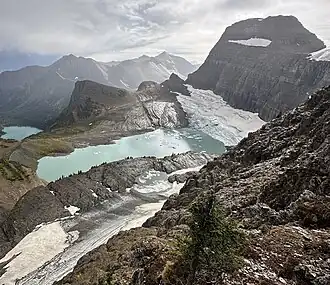 Grinnell Glacier is in the heart of Glacier National Park in the U.S. state of Montana. The glacier is named for George Bird Grinnell, an early American conservationist and explorer, who was also a strong advocate of ensuring the creation of Glacier National Park. The glacier is in the Lewis Range and rests on the north flank of Mount Gould at an altitude averaging 7,000 feet (2,100 m), in the Many Glacier region of the park.[3]