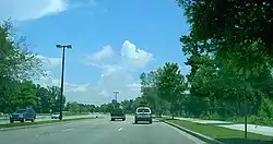 In July 2003, a $2.6 million upgrade to the Carolina Bays Parkway interchange began, providing additional access to Carolina Forest. An unpaved road called International Drive connected to S.C. 90, but provided no access to other main roads.[17] A year later, the road still had not been paved,[18] but by 2009 there was a plan to do so,[19] though as of 2016 the project was still delayed.[20] Grissom Parkway had become very popular with tourists, people living in the area, and businesses looking for a good location. However, the city did not intend the road to provide easy access to business, and policies assured this would continue to be the case.[18] International Drive officially opened July 25, 2018.[21]