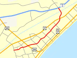 On April 5, 2002, the section between Harrelson Boulevard and U.S. 501 opened. On May 6, the section between U.S. 501 and Mr. Joe White Avenue (formerly 10th Avenue North) opened.[13][14] This was followed on July 1 by the section between 38th and 48th Avenues North. North of 48th Avenue, work had begun on the connection to Carolina Bays Parkway.[15] With the opening of Carolina Bays Parkway on December 17, 2002, Grissom Parkway was complete all the way from that new road to the airport,[16] with "tree-lined medians, trees planted on the shoulders of the road, bike paths and pedestrian sidewalks."[1]
