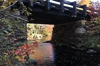 The Grist Mill Bridge is located in a rural part of far eastern Lebanon. The Little River Road runs generally southward, roughly following the course of the eponymous river as it makes its way south to the Salmon Falls River in Berwick. A short way south of the Lebanon-North Berwick Baptist Church, the road crosses the river at a point where it makes an S-shaped bend to the west. Just downstream (west) of the bridge stands the Old Grist Mill, which was built in 1774. Documents describing this mill indicate that a bridge was already standing at this location when it was built. State records of the bridge include photographic evidence from 1924, and records noting replacement of its deck in 1885. Documentary references to bridges at or near this location were also made in 1792 and 1822, but none of the documentation predating 1885 is conclusively connected to the present structure. The stonework of the bridge supports bears some resemblance to that of the mill foundation and what remains of its dam.[2]