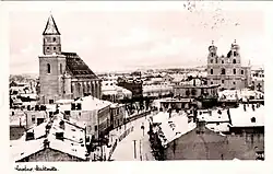 The Grodno Old Town was severely damaged during World War II and post-war authorities lacked will to preserve its heritage. The Church of the Blessed Virgin Mary, which because of its founder (14th century) was commonly referred to as Vytautas' Church, was first turned into a warehouse and eventually in 1961 was blown up by a decision of the Grodno Executive Committee.[47] The Grodno Town Hall (constructed in 1513) was demolished to expand Savieckaja Square. The early 17th century Baroque style Church of the Nativity of the Blessed Virgin Mary and Bernardine Monastery was demolished in 1951 also by a decision of the Grodno Executive Committee and the Grodno Regional Drama Theatre was built in its place.[48]