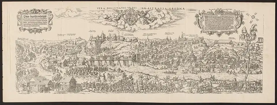 Grodno became part of the Grand Duchy of Lithuania in the 13th century, and the local stronghold was rebuilt by Lithuanians.[10] Prince Daniel of Galicia briefly captured the city in 1253 and once again attacked it in 1259.[10] In 1276, Duke Traidenis gave shelter in Grodno to Yotvingians fleeing the Teutonic Knights' massacre.[10] The city was unsuccessfully attacked by the Rus' princes and Tatars in 1277, then repeatedly attacked, with varying success, by the Teutonic Knights in 1283, 1296, 1306, 1311, 1312, 1328, 1361, 1363, 1373, 1375, 1377.[11] In 1358 a convention took place in Grodno on border disputes between Lithuania and the Polish Duchy of Masovia.[12]