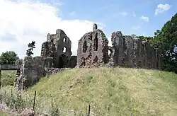 Grosmont Castle overlooks the village of the same name, and in its current form dates mostly from the work carried out by Hubert de Burgh with later 14th-century additions. It originally comprised an inner and an outer ward, but the latter has been encroached upon by local gardens.[6] The outer ward would have held a rectangular storehouse or stable.[6] The inner ward forms a stone castle with a gatehouse, two circular mural towers, a hall and a north accommodation block, the whole being protected by a ditch.[6] Originally other timber buildings would have been raised against the outer stone wall as accommodation for the castle's servants, but only limited traces of these survive.[26]