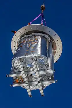 The telescope consists of two mirrors in a Mizuguchi-Dragone configuration, with a diameter of 30 cm (12 in). The telescope is inside the cryostat, which is mounted on a rotation table, with a rotary joint that provides helium gas and electricity to the cryostat.[2][3] The mirrors are cooled to 4 K (−269.15 °C) using a Pulse tube refrigerator to reduce the thermal noise from the mirror surfaces.[2]