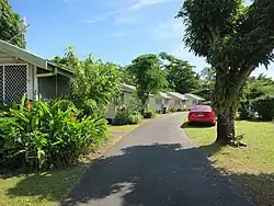 By September 1953, cottages had been built at Innisfail (11 units), Cloncurry (6 cottages), Inglewood (1 cottage), Texas (1 cottage), Warwick (8 cottages), Toowoomba (22 units), Mareeba (10 cottages), Ipswich (12 units), and Mackay (12 cottages under construction).[47] Other towns known to have carried cottage schemes through to completion include Maryborough, Atherton, Bowen and Blackall.[48][49][50][51][52] The types of accommodation constructed varied. In Toowoomba, eleven timber United States Army buildings were relocated to West Street and converted into duplex cottages, each housing two couples. This was one of the first schemes completed, with units available from December 1947.[53][54][55] In Innisfail, fibro-clad single and double units, and one four-unit cottage for women only, were built in different locations in the town so that the pensioners would be "part of the normal fellowship of suburban life".[47] In Mackay, a "model settlement" of 12 cottages and a communal laundry was designed by architect Karl Langer, built in a low, bungalow style serviced by a winding road.[56][57][58] In Cloncurry, six rectangular, concrete and brick cottages were constructed in a row on the edge of town.[59][60][61][62] While in Brassall, Ipswich, six double units, with tiled roofs and brick chimneys, were completed in 1953, each unit containing a bedroom, living room, kitchen, bathroom and verandah.[63][64] Cottages were let for an affordable rent, and pensioners interested in occupying them made an application to the local authority. Some schemes only permitted all males or all females to reside there, while others provided for mixed groups and married couples.[1]