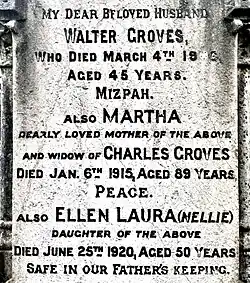 Arthur Groves (1861—1886). Born in Northamptonshire. Worked as an actor and comedian.[16][17] Arthur, who died of pulmonary tuberculosis at the age of 25, was the first of the Groves children to die, with his mother outliving him by almost thirty years.
