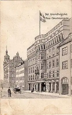 Kirkeligt Samfund af 1898 was founded by right-leaning Grundtvigians in opposition to Indre Mission as well as left-leaning Grundtvigians. It achieved more influence than its actual support would suggest. The Grundtvig House, a new headquarters for the organisation, was built in Studiestræde in Copenhagen in 1908. The building was designed by Rolf Schroeder. The building was for many years used as a venue for meetings, debates and lectures. After World War II, it was ceded to Copenhagen Municipality in connection with Kirkeligt Samfund's acquisition of Vartov.[1] The association gradually changed character and turned into am umbrella organisation for a number of Grundtvigian associations, communities, congregations and individuals. [2]