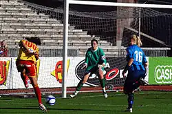 National team coach Siggi Eyjólfsson selected Guðbjörg in the Iceland squad for UEFA Women's Euro 2013,[10] while rival goalkeeper Þóra Björg Helgadóttir was recovering from a hamstring injury.[11] Guðbjörg took the goalkeeping position at the final tournament, playing in all three group matches and the 4–0 quarter-final defeat to hosts Sweden. The Swedish press hailed her as one of the best players at the competition.[12]