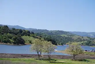The Guadalupe River watershed consists of 170 square miles (400 km2) of land within northern California's Santa Clara County. The surface runoff from this area drains into the Guadalupe River, its tributary streams, reservoirs or other bodies of water which all eventually gets carried into the San Francisco Bay (indicated below, with surrounding counties in red). Essentially, all the water from the creeks and rivers that make up the Guadalupe watershed, including water from storm drains, flows into the Guadalupe River, and then flows downstream into the San Francisco Bay at the Alviso Slough in Alviso. The Guadalupe watershed's main tributaries include Los Gatos Creek, Trout Creek, Hendrys Creek, Ross Creek, Pheasant Creek, Rincon Creek, Herbert Creek, and Golf Creek. Six major reservoirs exist in the watershed: Calero Reservoir on Arroyo Calero, Guadalupe Reservoir on Guadalupe Creek, Almaden Reservoir on Los Alamitos Creek, Vasona Reservoir, Lexington Reservoir, and Lake Elsman on Los Gatos Creek.