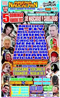 Guerra de Sexos (2012) (Spanish for "Battle of the Sexes") was the second annual Guerra de Sexos professional wrestling event produced by the International Wrestling Revolution Group. It took place on February 5, 2012, at Arena Naucalpan in Naucalpan, State of Mexico. The event title refers to the main event match, a steel cage match that featured male wrestlers, female wrestlers, Exótico wrestlers and Mini-Estrellas all competing against each other. The last person in the cage would be forced to either remove their wrestling mask, or if already unmask have their hair shaved off. The Under card featured two wrestlers from Asistencia Asesoria y Administracion (AAA), El Texano, Jr. and Toscano, who appeared due to IWRG's working relationship with AAA.