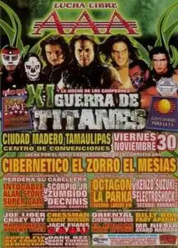 2007 Guerra de Titanes ("War of the Titans") was the eleventh Guerra de Titanes professional wrestling show promoted by Asistencia Asesoría y Administración (AAA). The show took place on November 20, 2007, in Madero, Mexico like the previous year's event. The Main event featured a 3 way Elimination match where the AAA Mega Champion El Mesias defended against Cibernético and El Zorro.