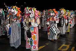 Guggenmusik is played during Fasnacht, the Swabian-Alemannic carnival season (Swabian–Alemannic Fastnacht), which is celebrated in various localities as the Basler Fasnacht, Luzerner Fasnacht, Eis-zwei-Geissebei in Rapperswil, and many other terms. The most common explanation of the word "Gugge" is that it may derive from the Alemannic "Sack/Tüte", meaning "bag". Other unsourced explanations include the word used for a small children's trumpet, a (Swiss German) word for "scream", or the cuckoo's call.[1] A "Guggemusik" band thus refers to a group of people playing loud music and typically wearing costumes and masks in a uniform style.