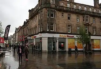 Perth Guildhall is a building at today's 102–106 High Street,[1] Perth, Scotland. The structure, which stands at the corner of High Street and King Edward Street, a block north of Perth City Hall, is Category B listed, dating to 1907.[2] It stands on the site of a former guildhall that existed between 1722 and 1907.[1][3] The previous building, which was torn down in May 1907,[4] also used to hold theatre plays.[4] Unlike today's three-storey structure, its predecessor was only two levels, the ground floor occupied by merchants, including D. Robertson booksellers[5] and James Wotherspoon's hatters[6] shortly before its demolition.[4]