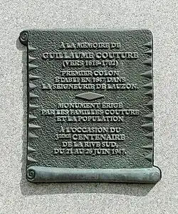 Guillaume Couture (January 14, 1618 – April 4, 1701) was a citizen of New France. During his life he was a lay missionary with the Jesuits, a survivor of torture, a member of an Iroquois council, a translator, a diplomat, a militia captain, and a lay leader among the colonists of the Pointe-Lévy (now named Lévis city) in the Seigneury of Lauzon, a district of New France located on the South Side of Quebec City.