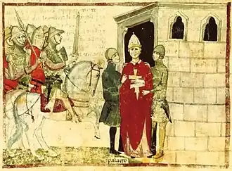 Soon afterwards he went to Italy. By the aid of a Florentine spy, Nogaret gathered a band of adventurers and of enemies of the Caetani (Boniface's family) in the Apennines. The great Colonna house, in a bitter feud with the Caetani, was his strongest ally, and Sciarra Colonna accompanied Nogaret to Anagni, Boniface's birthplace. On 7 September, with their band of some sixteen hundred men, Nogaret and Colonna surprised the little town.[4] The army attacked Boniface at his Palace in Anagni next to the cathedral. The Pope responded with a bull dated 8 September 1303, in which Philip and Nogaret were excommunicated.[5] Boniface was taken prisoner. Sciarra wished to kill him, but Nogaret's policy was to take him to France and compel him to summon a general council.[4] The French Chancellor and the Colonnas demanded the Pope's resignation; Boniface VIII responded that he would "sooner die". In response, Colonna allegedly slapped Boniface, a "slap" historically remembered as the schiaffo di Anagni ("Anagni slap").