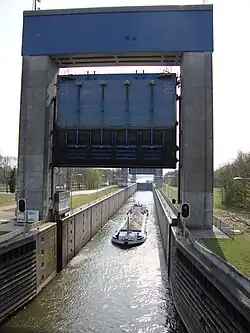 A guillotine lock is a type of canal lock. The lock itself operates on the same principle as any normal pound lock, but is unusual in that each gate is a single piece, usually of steel, that slides vertically upwards when opened to allow a boat to traverse underneath. The resemblance to the French guillotine is obvious.
