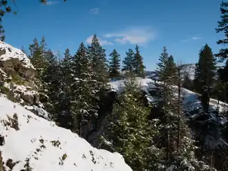 An inversion layer of cloud created by Pacific low pressure system moving into or stalling over the southern interior give Kelowna and the Okanagan Valley near constant cloudy conditions during December and January, making it the cloudiest winter climate in Canada, outside of parts of Newfoundland. Since Okanagan Lake rarely freezes, the warmer air from the lake rises above the colder atmospheric air, leading to a temperature inversion that also contributes to the valley being enveloped by clouds.[31] This valley cloud has a low ceiling, and often bright sunshine can be experienced by driving approximately 20 minutes up into the nearby mountains. Summer days in Kelowna are very warm with periods of hot and sunny conditions. Temperatures typically reach the high 30s °C, or above for at least a few days each summer. The hottest temperature ever recorded in Kelowna was 45.7 °C (114.3 °F) on June 29, 2021.[32] During summer, clear, dry air allows night-time temperatures to fall rapidly, however in the built-up city near lakeside, nights are somewhat warm on average by Canadian standards. The city averages about 380 mm (15 in) of precipitation per year, with about a fifth of the precipitation falling as snow, the bulk in December and January; however, June is the wettest month of the year, followed by a sharp drying trend through the remainder of summer.