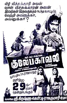 Gulebakavali (/ɡuleɪbəkɑːvəli/ transl. The Flower of Bakavali) is a 1955 Indian Tamil-language action adventure film produced and directed by T. R. Ramanna, and written by Thanjai N. Ramaiah Dass. The film stars M. G. Ramachandran, T. R. Rajakumari, Rajasulochana and G. Varalakshmi. Based on the story of the same name from the Arabic folklore collection, One Thousand and One Nights, it tells the story of a young prince who sets out to the kingdom of Bakavali to find a mysterious flower which is believed to have the power to restore his father's eyesight. The film was released on 29 July 1955 and became a commercial success.