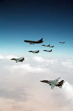 On the eve of Operation Desert Storm, the Coalition of the Gulf War numbered 2,430 fixed-wing aircraft in the Kuwaiti Theater of Operations (KTO), almost three-fourths of which belonged to the United States Armed Forces. When the ground assault began on 24 February, that number had increased to over 2,780. Representing a relatively high tooth-to-tail ratio, approximately 60 percent of Coalition aircraft were "shooters" or combat aircraft.[11] The United States Air Force deployed over 1,300 aircraft during the course of the campaign, followed by the United States Navy with over 400 aircraft and the United States Marine Corps with approximately 240. Collectively, the other Coalition partners accounted for over 600 aircraft.[1]