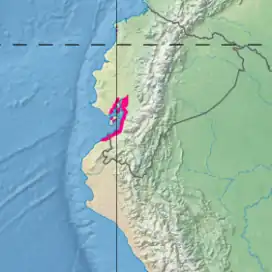 The mangroves are found between Ecuador and Peru where many rivers empty into the Pacific and the Gulf of Guayaquil. They fringe the Gulf of Guayaquil and the northwestern Pacific Coast of Peru near Tumbes. They cover an area of 1,300 square miles (3,400 km2).[1] Inland the mangroves transition into areas of Ecuadorian dry forests, Western Ecuador moist forests and in the south the Tumbes–Piura dry forests, which extend into Peru.[2]