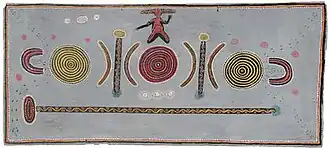 Kaapa's sure, fluid hand is discernible everywhere, from the red and yellow ochre border with fine white dots along the inner rim, to the lithe, lifelike figure in elaborate corroboree paint and headdress kneeling at the top centre. The design of the painting is balanced and, like most of Kaapa's subsequent work, symmetrical as to the elements arranged between this figure and the large ceremonial pole that runs along the base of the painting.[9]