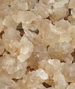 Gum karaya or gum sterculia, also known as Indian gum tragacanth, is a vegetable gum produced as an exudate by trees of the genus Sterculia. Chemically, gum karaya is an acid polysaccharide composed of the sugars galactose, rhamnose and galacturonic acid. It is used as a thickener and emulsifier in foods, as a laxative, and as a denture adhesive. It is also used to adulterate Gum tragacanth due to their similar physical characteristics. As a food additive it has E number E416.
