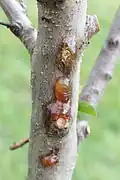 Gummosis is the formation of patches of a gummy substance on the surface of certain plants, particularly fruit trees.[1] This occurs when sap oozes from wounds or cankers as a reaction to outside stimuli such as adverse weather conditions, infections, insect problems, or mechanical damage. It is understood as a plant physiological disease.[2]