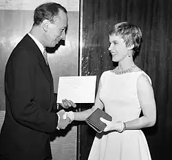![]() Skandia Cinemas. Actress Bibi Andersson receives Daniel Engdahl's scholarship of SEK 2,000 from Gunnar Sjöberg, 1957. | |