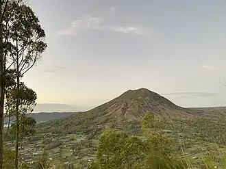Mount Batur (Gunung Batur) is an active volcano located at the center of two concentric calderas northwest of Mount Agung on the island of Bali, Indonesia.[1] The southeast side of the larger 10×13 km caldera contains a caldera lake. Both the larger caldera, and a smaller 7.5 km caldera were formed by a collapse of the magma chamber, the first larger collapse taking place about 29,300 years ago, and the second inner caldera collapsing about 20,150 years ago.[2] Another estimate of the inner caldera's formation date, formed during the emplacement of the Bali (or Ubud) ignimbrite, has been dated at about 23,670 and 28,500 years ago.[3]