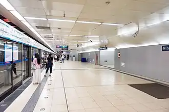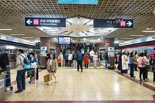 Guomao Station (simplified Chinese: 国贸站; traditional Chinese: 國貿站; pinyin: Guómào Zhàn) is an interchange station on Line 1 and Line 10 of the Beijing Subway at the China World Trade Center.[1] Guomao is the Chinese abbreviation for China World Trade Center. It is located in Chaoyang District. The station handled a peak passenger traffic of 359,800 people on May 5, 2013.[2]
