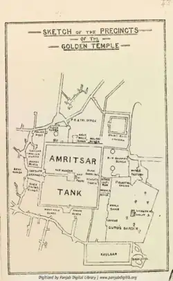 There were formerly cenotaphs (samadh) located in the courtyard of Gurdwara Baba Atal, with the one immediately south of the structure being for Baba Mohan (who Baba Atal had revived as per the tale) and in the east the cenotaphs of Nawab Kapur Singh of the Faizalpuria Misl and Jodh Singh (Adalati).[4] Another cenotaph located in the southward direction was Jassa Singh Ahluwalia's.[4] To the west was the cenotaph of Ganda Singh, which contained a mural of Baba Atal.[4] To the northwest lay the cenotaph of Sant Singh Giani, which contained murals depicting Indic deities.[4] On the other-side of the southern buildings was a cremation-ground and various other cenotaphs.[4] Around the Kaulsar tank, there were trees which were inhabited by bats.[4]