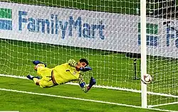 He was then called up to the 23 men senior Indian squad for the 2011 AFC Asian Cup. He made his debut against Turkmenistan in a 1–1 draw.[53] He was called up to the 2018 FIFA World Cup qualifier squad against Nepal but was unused in both legs.[54] Gurpreet made his second appearance for the senior team against Iran in a 2018 World Cup qualifier at Bangalore, starting in a 0–3 defeat.[55] He made his next appearance against Turkmenistan in a 2–1 loss on 8 October.[56] He also kept a clean-sheet against Guam on 12 November 2015, a game that ended 1–0.[57] He kept his second clean sheet against Sri Lanka in a 2–0 win in the SAFF Suzuki Cup 2015.[58] In 2016, he captained the India national team against Puerto Rico[59] and played an essential role against India's 1–0 victory against Kyrgyzstan in a 2019 AFC Asian Cup qualification game in 2017.[60][61]