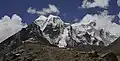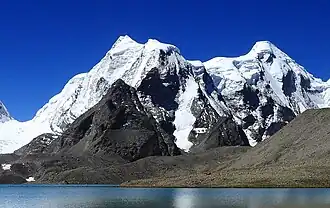 Gurudongmar is a 6,715-metre (22,031-foot) glaciated double summit in the Himalayas. The lower peak, Gurudongmar West, rises to an elevation of 6,630 metres and is 1.6 km west of the main summit.[5] The mountain is situated in the state of Sikkim, 70 kilometres (43 mi) north of the capital city of Gangtok. Precipitation runoff from this mountain's slopes drains north into the Teesta River drainage basin and south into the Lachung River drainage basin. Topographic relief is significant as the northeast slope rises 1,165 metres (3,822 ft) in one kilometre (0.62 mi). The first ascent of Gurudongmar was achieved in 1936 by Eric Shipton and Edwin Kempson via the west ridge.[6] However, the possibility exists that they only climbed Gurudongmar West, having regarded the main summit as an entirely different mountain, which in that case would make the first ascent in 1991 by an Indian team composed of Lakpa, Nima, P. Lakpa, and Sepley from the Sonam Gyatso Institute in Gangtok.[7] The mountain's name means the "incarnation of Guru Rimpoche" and the mountain is named in association with Gurudongmar Lake which is four kilometres (2.5 mi) to the north.[6]