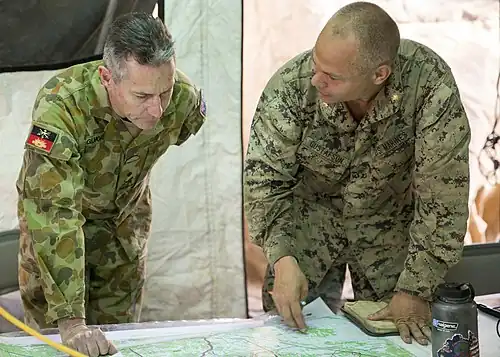Gilmore was selected to command the Special Operations Forces assigned to the International Security Assistance Force (ISAF), and redeployed to Afghanistan to take up the role in October 2009. The posting lasted twelve months and, on his return to Australia, he was promoted major general and succeeded Major General Tim McOwan as Special Operations Commander Australia (SOCAUST) in January 2011.[7][9][11] As SOCAUST, Gilmore was responsible to both the Chief of Army and Chief of Joint Operations for the training, capability development, and operations of Australia's special forces.[21] In November 2012, Gilmore represented the Australian Army and Special Operations Command during the reinterment of two Australian soldiers at Port Moresby (Bomana) War Cemetery. Both men had been killed while serving with Z Special Unit during the Second World War.[22]