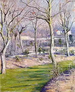 While Caillebotte was known for his urban and domestic scenes, he also painted many rural scenes of the area around his home in the years before his death.[28] His work had shifted to en plein air works of landscape painting, especially river scenes.[10]