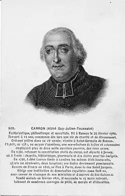 Born in Rennes, Carron received was tonsured at the age of thirteen. In 1785, having been profoundly affectedby the poverty throughout his province, he conceived the idea of erecting an institution of charity, for which he interested a number of noble families, who contributed large sums to the execution of his plan; so that in 1791 in the city of Rennes, he came into possession of cotton spinning mills, weaving establishments, etc., which occupied more than two thousand working people of both sexes, under his direction.[1] He also founded an institution for young women trying to escape a life of prostitution. However, in 1790, following the French Revolution, he became a non-juror, refusing to swear to the Civil Constitution of the Clergy, and was imprisoned.[2]