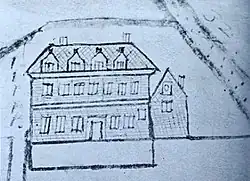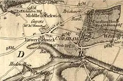 The first residents of the house were the Snelling family who built a small farmhouse. In 1678 they sold it to Edward Bayley who transformed it into a very substantial building. A sketch of this house is shown. Edward was a member of the Quakers who were very prominent in Pickwick at this time and he is listed in the Quaker burials.[2] Sometime after his death in 1707 it was sold to the Bennett family. The most likely Bennett would be Thomas Bennett who opened a Quaker Boarding School in Pickwick in about 1725.[3] After Thomas died in 1764 his son John Bennett took over teaching at the school. A map of 1773 (shown at left) shows that John Bennett owns a property called Guyers at this time. John died in 1802 and by 1813 Thomas Pycroft (1774–1849) owned the house.[4]