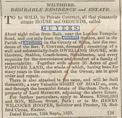Thomas Pycroft was barrister who practiced in Bath. He was born in 1774 in Essex and gained his qualifications in 1811. In 1805 he married Mary Collinson. The couple lived in Hempstead, Essex for several years then in about 1813 moved to Guyers House.[5] They had seven children two of whom two became notable as they have entries in the Dictionary of National Biography.[6][7] In about 1830 Thomas and his wife moved to Bath. He died in 1849 and is buried in St Bartholomew’s churchyard, Corsham. His tombstone is well preserved and states that he lived at one time in Guyers House.[8] Reverend Timothy Conyers moved to Guyers House with his mother in about 1831.[9]