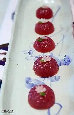 Gwapyeon (Korean: 과편) is a jelly-like hangwa (traditional Korean confection) made with fruits.[1] The colorful fruit jelly is commonly served at banquets.[2] This classic dessert was served in the royal court during the Joseon dynasty.[3]