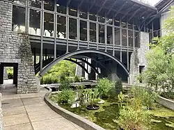 The building's location was chosen to minimize the need for grading, and because the chosen location had a dry ravine that was built over, with one wing on each side of the ravine with a bridge over the ravine connecting the two wings.[12] The ravine was turned into a man-made stream made of reinforced concrete that flows between the two wings of the center[5] and acts as a horizontal cooling tower.[14]