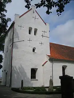 Gylle Church was probably erected at the end of the 12th century, but has been subsequently changed and reconstructed on numerous occasions. The church tower dates from the late Middle Ages, probably the 15th or 16th century. In 1875, the church was substantially enlarged and altered.[1][2] A large crucifix from the second half of the 15th century is preserved in the church,[3] while the altarpiece is from 1580, in Renaissance style.[2] The altarpiece has been re-painted several times, but during a renovation in 1936, the original paintings were restored.[4] The pulpit is also from the 16th century.[2]